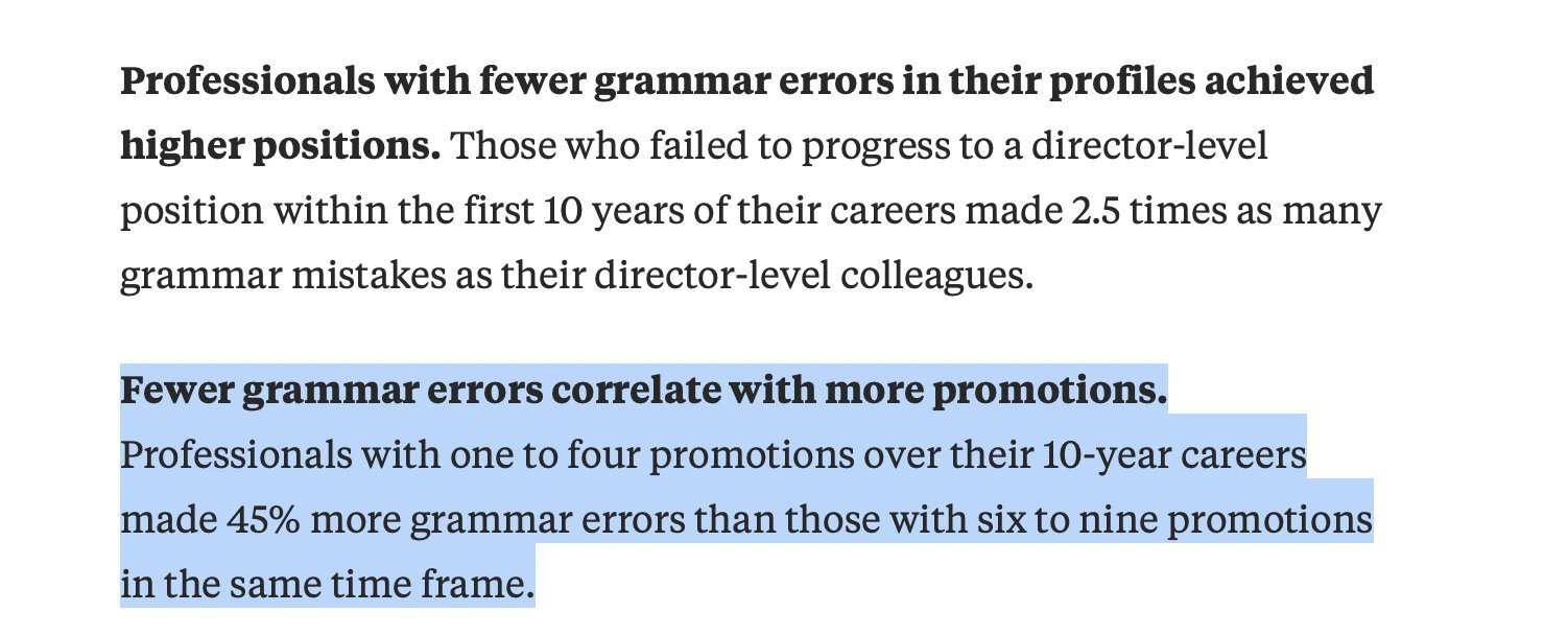 Grammarly küçük bir grupta yaptığı araştırmada, kariyerinin ilk on yılında direktör seviyesine yükselemeyen insanların, direktör seviyesindekilere göre iki buçuk kat daha fazla gramer hatası yaptığını bulmuş.