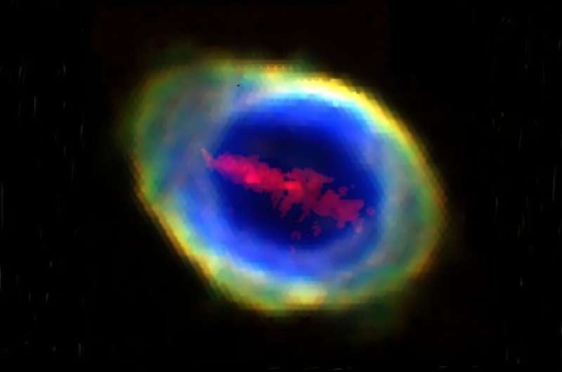 Avrupalı bir araştırma ekibi, Halka Bulutsusu’nun (Messier 57) merkezinde daha önce hiç görülmemiş, çubuk şeklinde bir demir bulutu keşfetti. William Herschel Teleskobu’na kurulu yeni WEAVE/LIFU spektrografı sayesinde tespit edilen bu yapı, dört kez iyonize olmuş demir atomlarından oluşuyor. Yaklaşık Plüton’un yörüngesinin 500 katı uzunluğundaki çubuğun demir kütlesi Mars’a yakın. Yapının nasıl oluştuğu henüz bilinmiyor: yıldızın ölümü sırasında gerçekleşen gaz atımının beklenmedik bir sonucu ya da yıldızın genişlemesi sırasında buharlaşan kayalık bir gezegenin kalıntısı olabilir. Araştırmacılar, daha yüksek çözünürlüklü gözlemlerle hem bu gizemin çözülmesini hem de benzer yapıların başka gezegenimsi bulutsularda bulunup bulunmadığının anlaşılmasını hedefliyor.