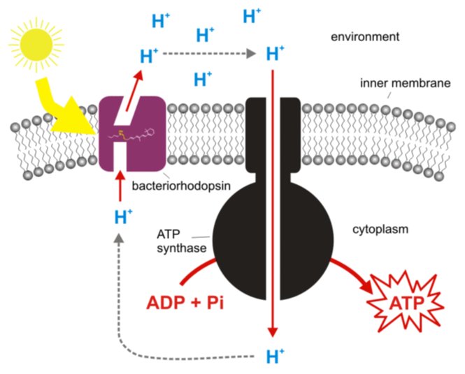Halofilik arkelerin bacteriorhodopsin proteini ile fotosentez gibi ışık enerjisini kullanıp, kimyasal enerjiye dönüştüren bir mekanizmaya sahip olduğunu öğrendim. Bacteriorhodopsin ışık enerjisini kullanarak protonları hücre dışına çıkarıyor. Ardından ATP sentaz ile ATP üretimi gerçekleşiyor.