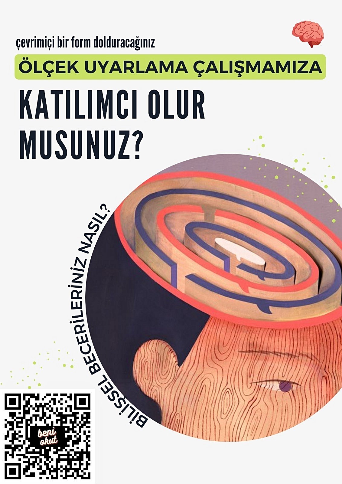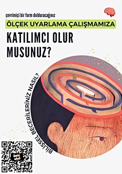 Herkese merhaba, Ben Hacettepe Üniversitesi Klinik Psikoloji YL öğrencisi Güzide Memişçi. Prof. Dr. Müjgan İnözü ve Arş. Gör. Ezgi Trak ile bir ölçeği dilimize kazandırmayı hedefliyoruz. Yaklaşık 20 dk. süren çevrim içi bir formu doldurarak katılım sağlamış olacaksınız. Bilime katkı sağlamak ve bize destek olmak isterseniz link üzerinden katılım sağlayabilirsiniz. Çok teşekkürler. https://forms.gle/FLetSqZVA5c4uEqf7