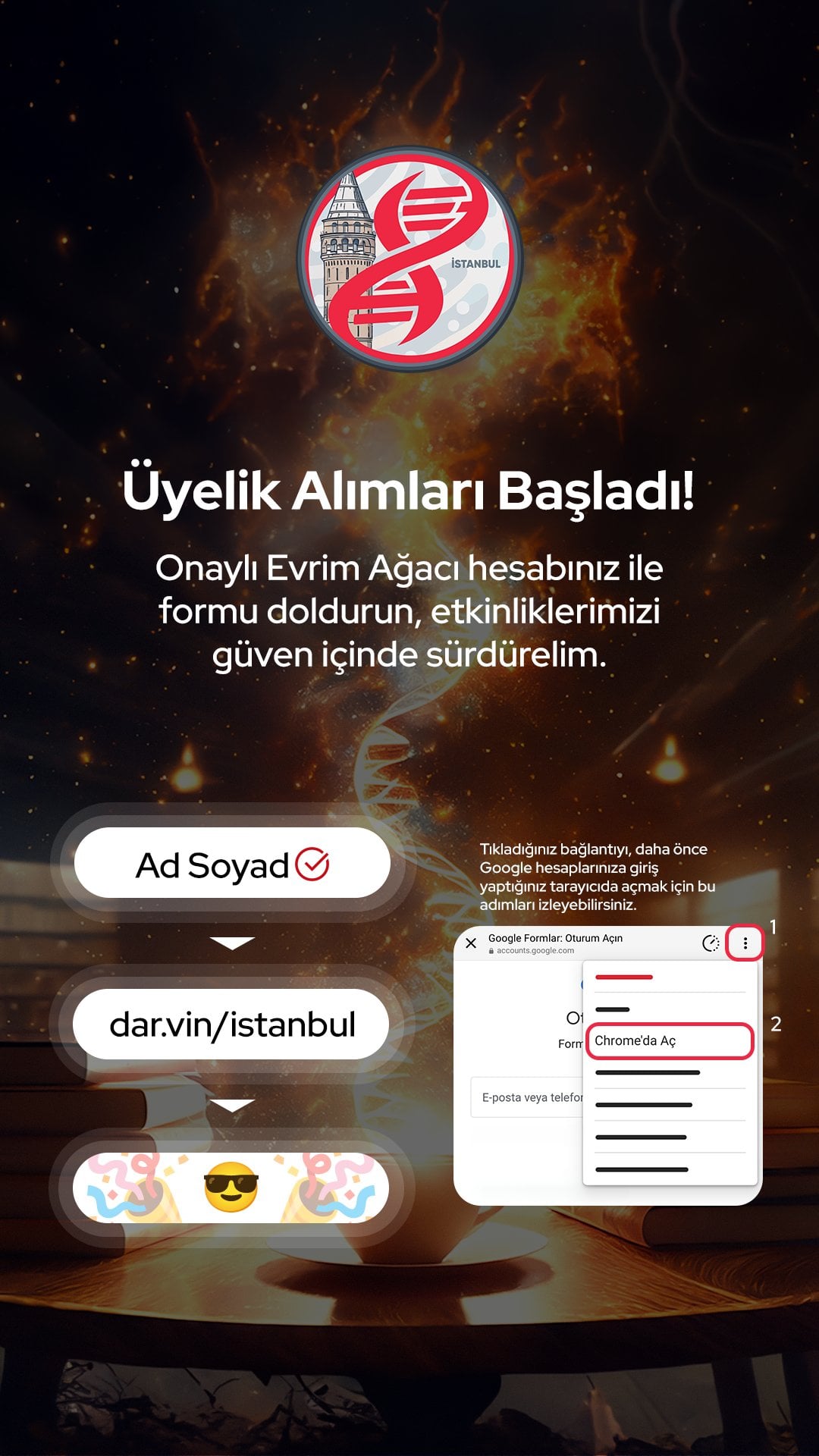 Herkese yeniden merhaba, topluluğumuza üyelik alımlarını yeniden açmış bulunmaktayız. İstanbul'da yaşayan tüm bilimseverleri 29 Eylül 2024 tarihine kadar üyelik alımlarına başvuru yapmaya davet ediyoruz. Aşağıdaki bağlantıya tıklayarak üyelik formuna ulaşabilirsiniz.