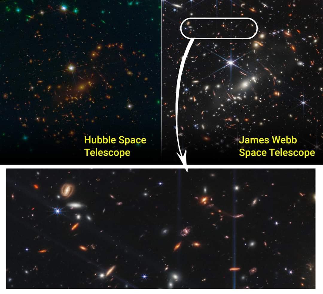Hubble ve Webb uzay teleskoplarının gözlemlediği aynı noktadan alınan görüntülerin bir karşılaştırması.