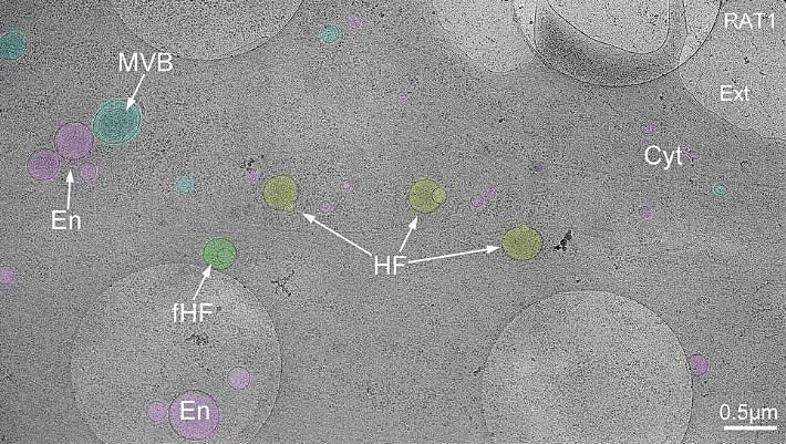 Virginia Üniversitesi ve Ulusal Sağlık Enstitüleri'nden bilim insanları, hücre çevresindeki veziküler organellerin %10'unu oluşturan hemifuzomları keşfetti. Kryo-elektron tomografi kullanılarak görüntülenen bu organeller, vezikül oluşumunu kolaylaştırarak hücresel sıralama ve geri dönüşüm süreçlerinde kritik rol oynuyor. Hemifuzomların işlevsel bozuklukları Hermansky-Pudlak sendromu gibi albinizm, görme sorunları ve kan pıhtılaşma bozukluklarına neden olan genetik hastalıklarla ilişkilendiriliyor. Bu keşif, karmaşık genetik hastalıkların tedavisinde yeni stratejiler geliştirilmesine yol açabilir.