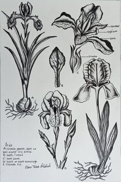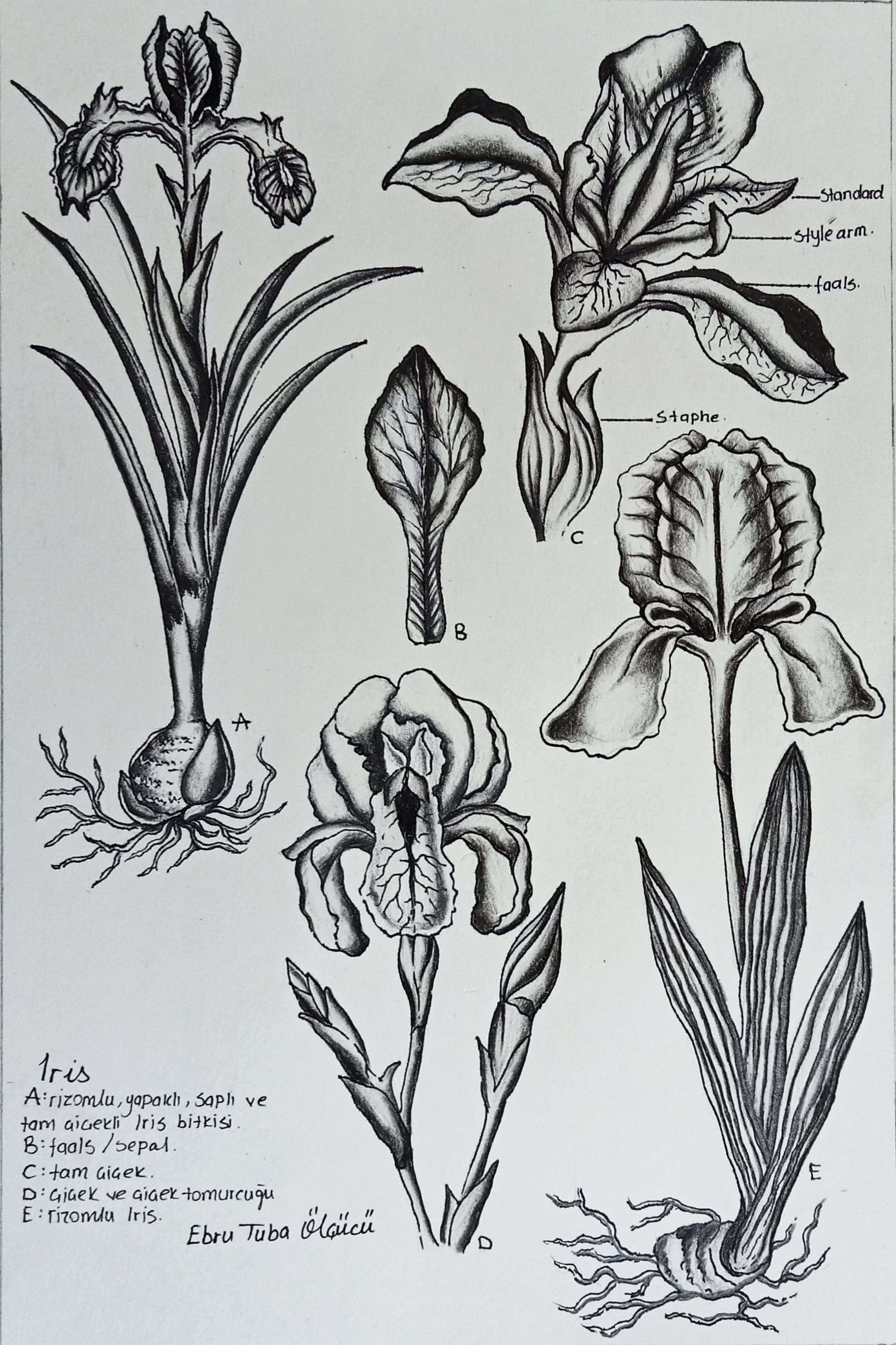 Iris çiçekleri karşımıza çok farklı şekil ve renklerde çıkıyor. Bu çeşitlilik onları çizmem için ilham oldu. Eski uygarlıklardan günümüze iris adına birçok anlam atfedildi. Örneğin Antik Mısırlılar için iris çiçeği görkem ve gücün sembolüydü iken Yunan mitolojisinde tanrıların habercisi olmakla birlikte sadece iyi haberleri getirdiğine inanılırdı. Bitkinin sağ yanındaki harflerin karşılığını sol alttan okuyabilirsiniz.
