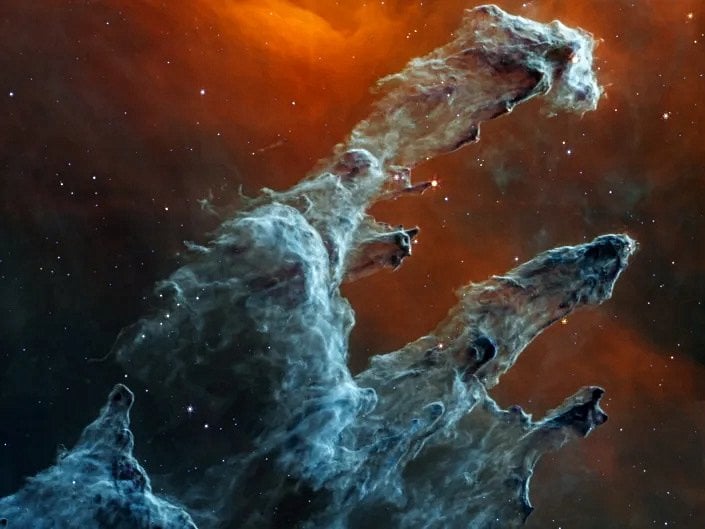 Cuma günü James Webb Uzay Teleskobu, Yaratılış Sütunlarının yeni, orta-kızılötesi bir görüntüsünü yayınladı. Görüntü, bilim insanlarının bölgede ne kadar kozmik tozun yıldız oluşturmak için gerekli olduğunu görmelerini sağladı. Bu ay yayınlanan ek görüntüler arasında VV 191 gökada çifti ve ağaç halkalarına benzeyen kozmik toz yer alıyor. Yeni fotoğraflar, 5,6 milyar ışıkyılı uzaklıktan bir yıldız kümesini içeriyordu.