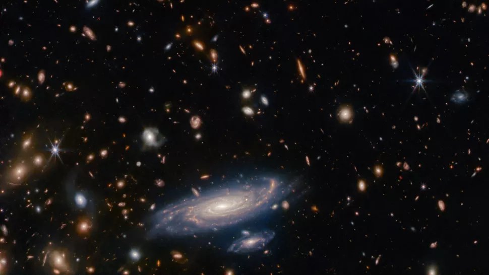 NASA'nın James Webb Uzay Teleskobu'ndan yeni yayınlanan bir görüntü, uzak bir sarmal gökadanın çarpıcı ayrıntılarla öne çıktığı kalabalık bir gökada ve yıldız alanını gösteriyor. Görüntünün altında yer alan büyük gökada LEDA 2046648, James Webb Uzay Teleskobu görüntüsünde o kadar net ki, 1 milyon ışık yılı uzaklıktaki ayrı ayrı sarmal kolları görülebiliyor.