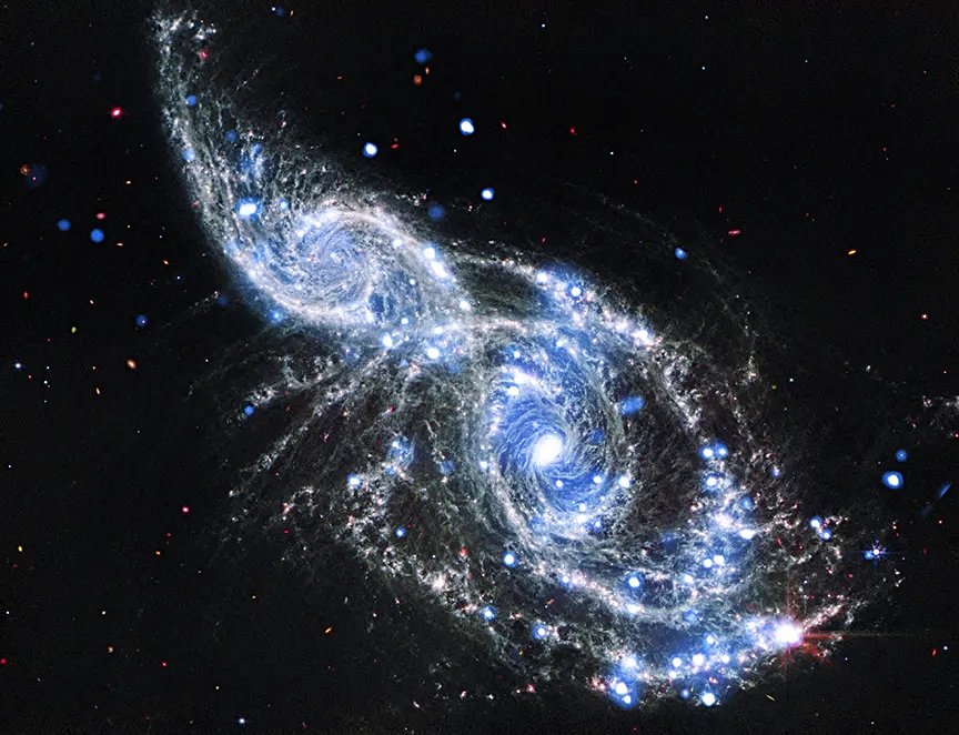 James Webb Uzay Teleskobu’nun kızılötesi verileri ile Chandra X-ışını Gözlemevi’nin yüksek enerjili gözlemleri birleştirilerek, NGC 2207 ve IC 2163 adlı iki sarmal galaksinin çarpışması ayrıntılı biçimde görüntülendi. Dünya’dan yaklaşık 120 milyon ışık yılı uzaklıktaki bu sistemde, galaksilerin karşılıklı kütleçekimi sarmal kolları büküyor, gaz ve tozu sıkıştırıyor ve yeni yıldız oluşumlarını tetikliyor. Ortaya çıkan yapı, galaksi birleşmelerinin nasıl ilerlediğini anlamak için önemli ipuçları sunuyor.