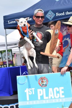 Kaliforniya'da gerçekleştirilen Surf-A-Thon Köpek Sörfü yarışmasında birinci olan Sugar.
