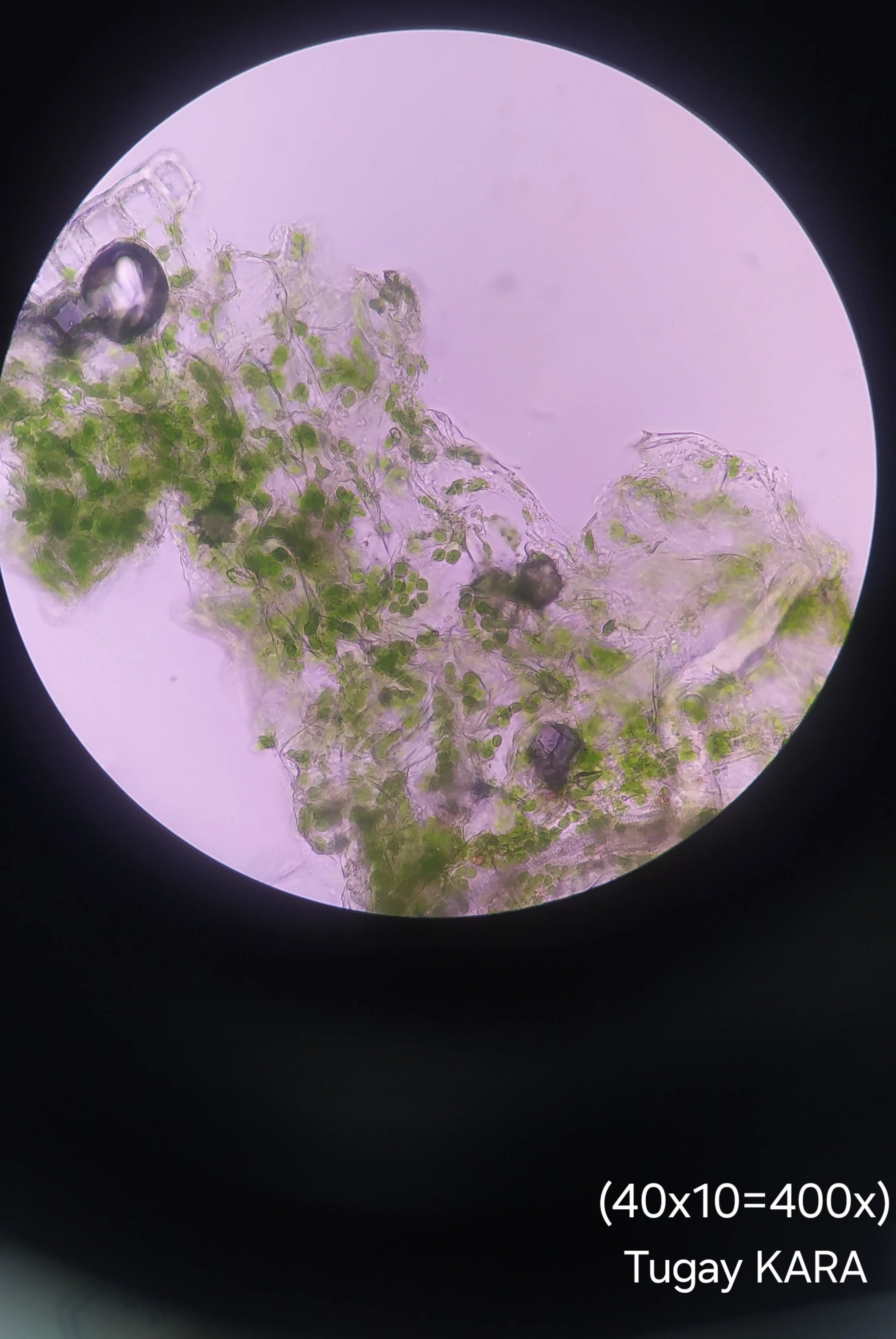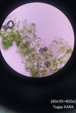 Bir yapraktan aldığımız kesiti mikroskop altında incelediğimizde klorofil pigmentinin olduğu kloroplastları görmekteyiz. Görseldeki yeşil noktalar bize yapraktaki kloroplastları göstermektedir.
