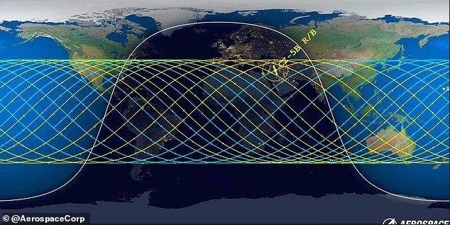 Uzmanlar, muhtemelen nüfuslu bir bölgede Pazar günü erken saatlerde Dünya'ya çarpacağını söylüyor. Aerospace Corporation, ekvatorun binlerce mil kuzeyine ve güneyine yayılan, enkazın düşebileceği devasa bir alanını vurguluyor. Sarı simge, roket enkazının yeniden giriş penceresinin nerede olacağını gösteriyor.