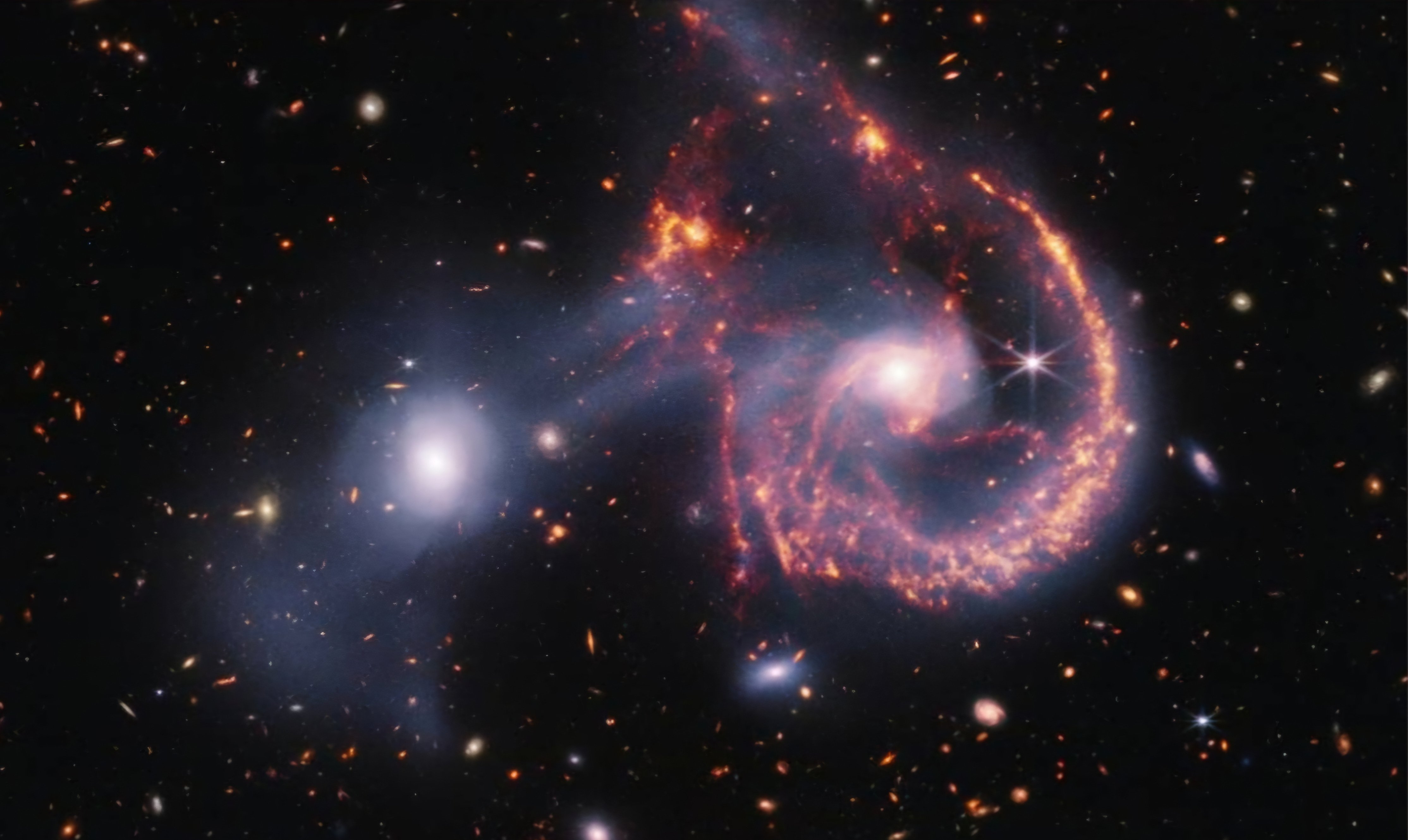 465 milyon ışık yılı uzaktaki Küçük Aslan takımyıldızında birleşmekte olan iki galaksinin görüntüsü,James Webb Uzay Teleskobu tarafından kaydedildi.