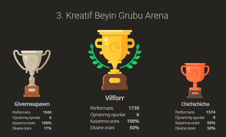 Kreatif Beyinler Grubu 3. Satranç Turnuvası'nı kazanan Vilforr Lichess kullanıcı adlı üyemizi ve Satranç Şampiyonu rolünü kazanan Atahan (ata0140 - Givemeapawn) adlı üyemizi tebrik ediyoruz.
