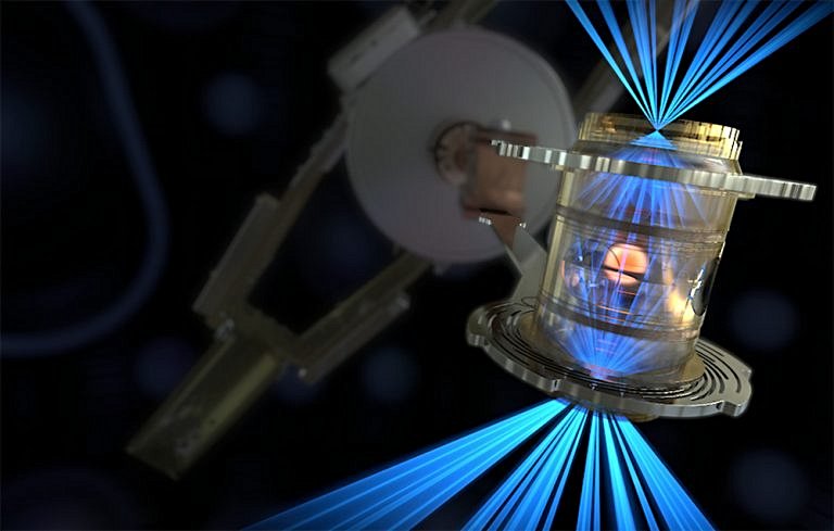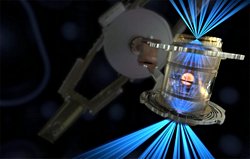 Lazer enerjisi, bir yakıt kapsülünü patlayana kadar sıkıştıran bir kutu içinde X-ışınlarına dönüştürülüyor.