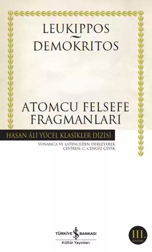 Leukippos - Demokritos, Atomcu Felsefe Fragmanları. Çev. C. Cengiz Çevik. Türkiye İş Bankası Kültür Yayınları, 2019.