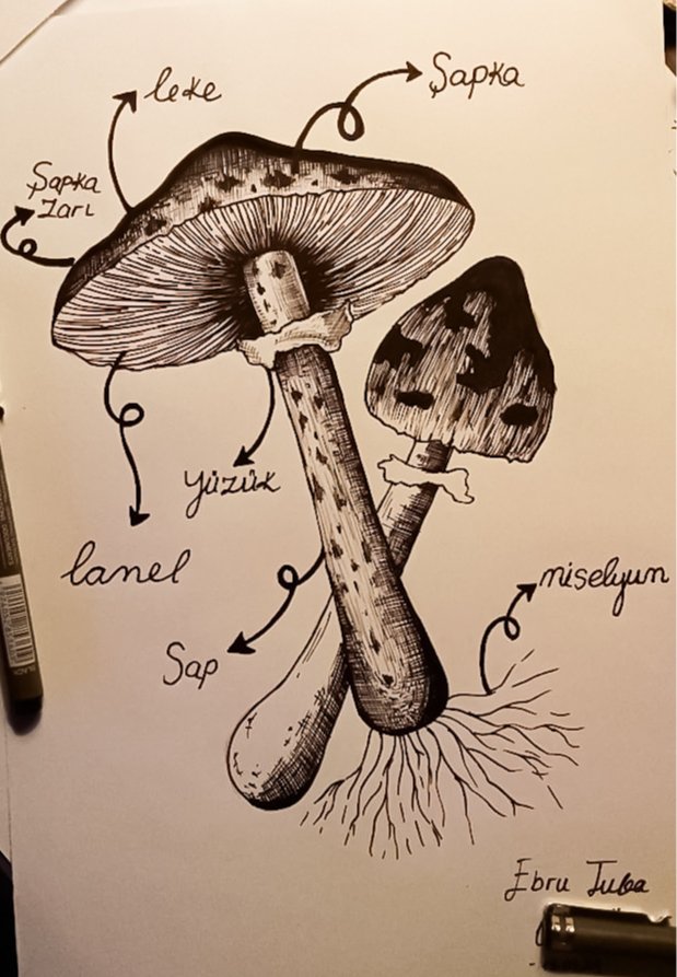 Mantarlar çok farklı formlarda karşımıza çıksa da, gözde canlanan ilk mantar formu aşağıda çizdiğim şekildedir. Karşınıza çıkan, bilmediğiniz hiçbir mantara dokunmayın, koklamayın ve yemeyin! Gözle görülemeyen sporlar, solunum yolu üzerinde alerjik reaksiyonlar gösterebilir.