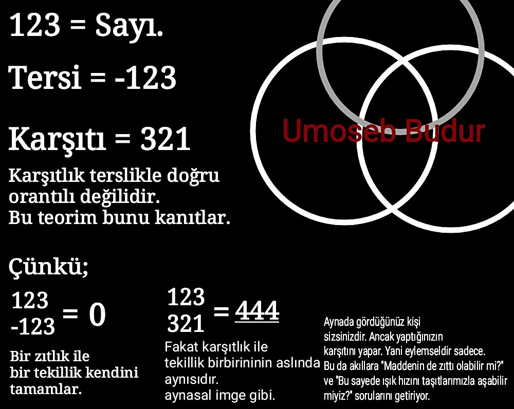 Matematik için eskiden bulduğum bir teori vardı. "Umoseb Sayıları" teorisini 12-13 yaşlarımda bulmuştum ve ancak şu an paylaşabiliyorum. Bu teori aslen matematik sayılarının karşıtlarının olabileceğini savunur. Fiziğe uyarlanabilir. İlk teori maddesi, bu teoriyi sırayla giden ilk üç sayıyı örnek almıştır. 1, 2, 3 sayıları 123'ü oluşturur. Bunun tersi bize -123'ü verir. Ama 123'ün karşıtı 321'dir ve bu da Umoseb'dir.