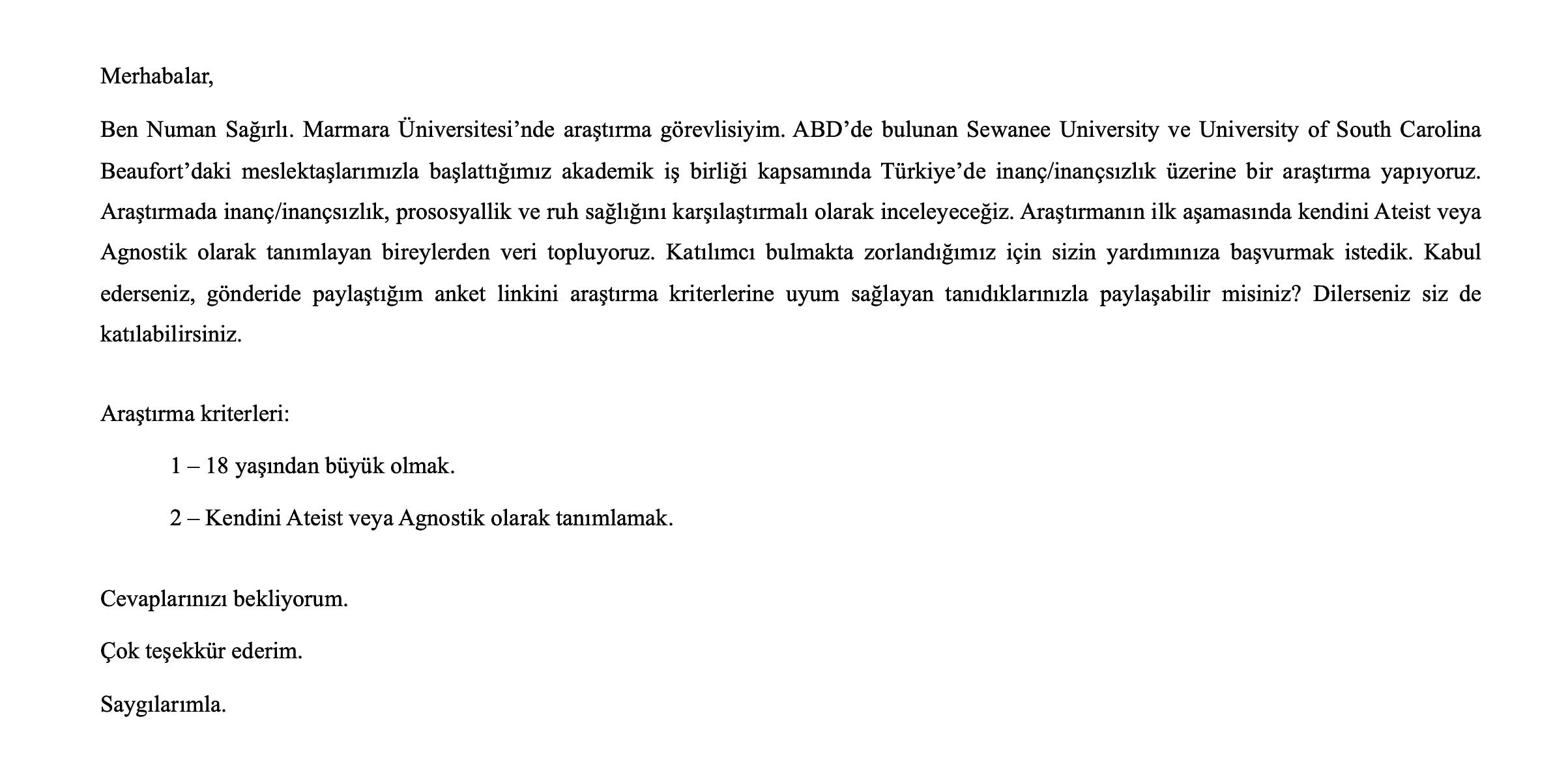 Görselde detaylarını açıkladığım araştırmamız için katılımcı ihtiyacımız var. Bağlantıya eklediğim anket linkini araştırma kriterlerine uyan tanıdıklarınızla paylaşabilir misiniz? Dilerseniz, siz de anketi cevaplayarak destek olabilirsiniz. Herhangi bir sorunuz olursa, memnuniyetle cevaplayabilirim. Destekleriniz için şimdiden çok teşekkür ederiz. Hepinize iyi çalışmalar!