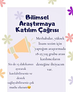 Ben Beste,Gelişim Psikolojisi Yüksek Lisans programı kapsamında yürüttüğüm bu çalışma için 18-25 yaş grubu arasında olan ve üniversite okuyan katılımcılara ihtiyacım var.