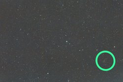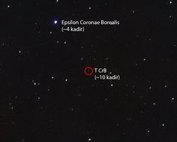 Son yılların en önemli gök olaylarından birisinin bu sene içerisinde eylül ayına kadar gerçekleşmesi bekleniyor! 18-55 mm kit lens kullanarak ve 40 adet görüntü istifleyerek çektiğim bu fotoğrafta ortadaki kırmızı daire içerisinde yer alan T CrB ikili yıldız sistemi bir nova patlaması geçirecek. Bu olay sonucunda sistemin parlaklığı birkaç günlüğüne 2 kadir değerine kadar yükselecek (mavi daire içerisindeki yıldızdan daha parlak olacak) ve çıplak göz ile rahatlıkla şehirden bile görülebilecek. Şanslıyız ki T CrB'nin yer aldığı Kuzey Tacı takımyıldızı eylül ayına kadar gökyüzünde yükseklerde olacak.