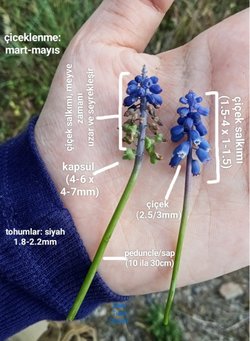 Muscari armeniacum bitkisinin tohumları nasıl oluşuyor? Arılar da dahil olmak üzere çok çeşitli tozlaştırıcıları çiçeklerinden salgıladığı nektarla kendine çeker ve böylece polinasyon (tozlaşma) meydana gelir. Arazide bulduğum bu iki M. armeniacum'dan soldaki, artık kapsül oluşturmuş. Yakında kapsüller kuruyacak, açılacak ve içlerinden 3 adet tohum çıkacak.