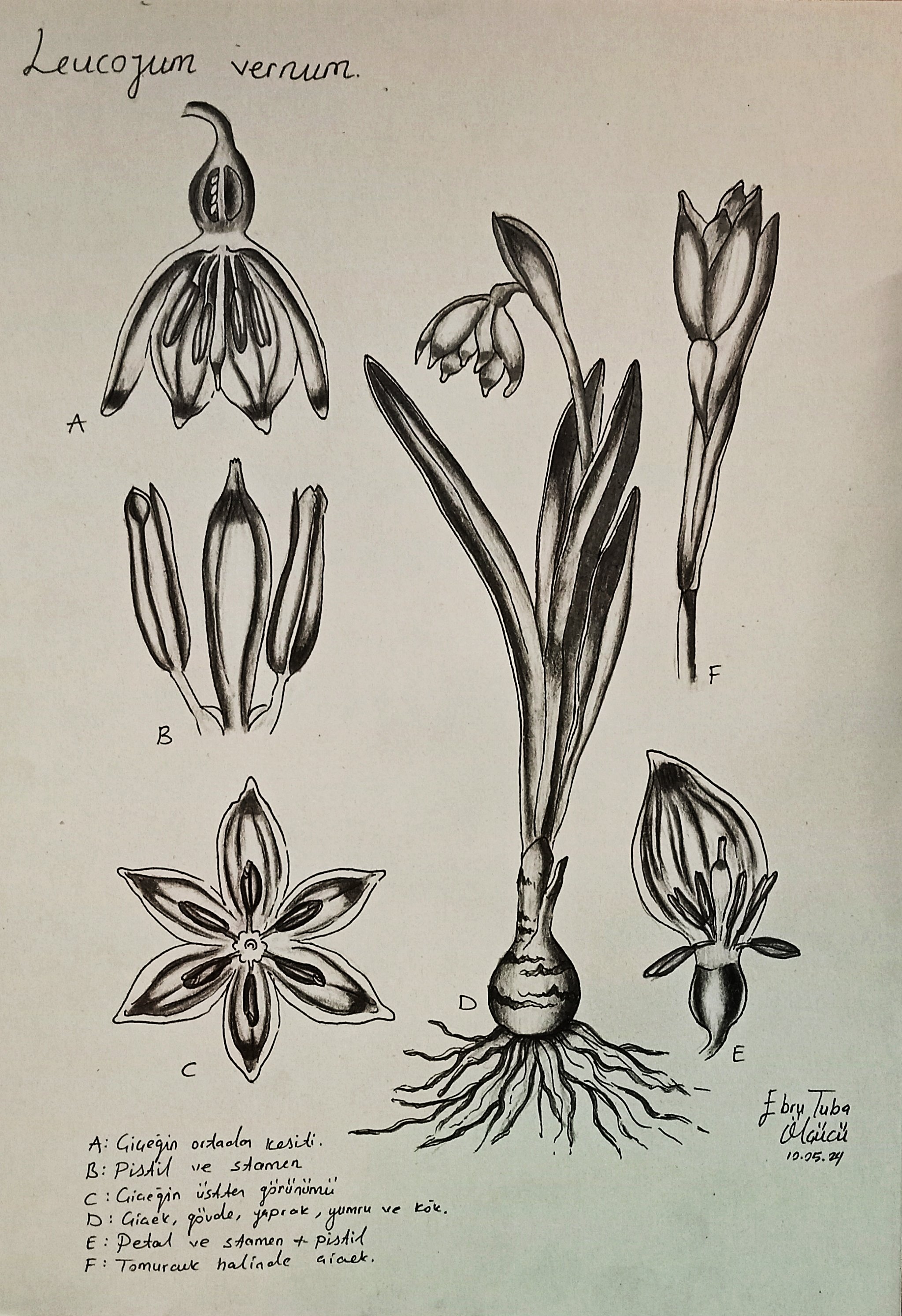 Narin görüntüsü ile beni her zaman büyülemeyi başaran Leucojum vernum bitkisini çizerken de aynı hayranlığı yaşadım. Amaryllidaceae (Nergisgiller) familyasına ait olup, çok yıllık, soğanlı ve çiçekli bitkidir. Petal uçlarında bir çıkıntı vardır ve sarı nokta bulunur.