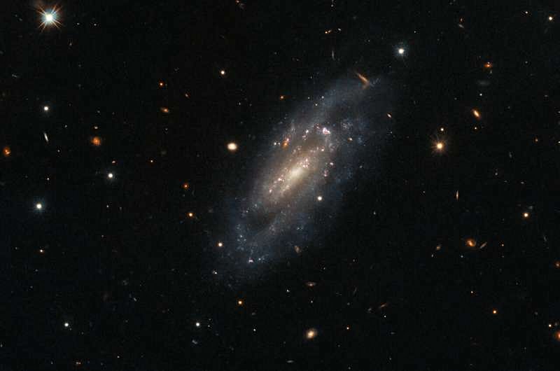 NASA/ESA Hubble Uzay Teleskobu'ndan alınan bu görüntüde sarmal gökada UGC 11860, arka plandaki gökadalardan oluşan bir alana karşı sakince süzülüyor gibi görünüyor. UGC 11860, Pegasus takımyıldızında yaklaşık 184 milyon ışıkyılı uzaklıkta yer almaktadır ve sorunsuz görünümü aldatıcıdır; bu galaksi son zamanlarda neredeyse hayal edilemeyecek derecede enerjik bir yıldız patlamasına ev sahipliği yaptı.