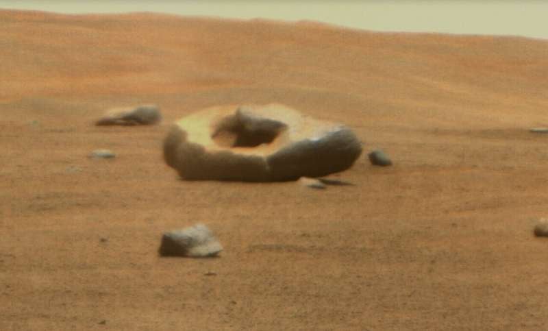 NASA'nın Perseverance Mars gezgini, Jezero Krateri'nde bir çörek şeklindeki kayayı keşfetti. Bu garip şekilli kayalar, rüzgarın etkisiyle oluşurken, bu özel kaya bir aşınmış kayanın ardından genişleyen bir boşluk bırakmış olabilir.