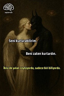 Ne melek bütünüyle iyi ne şeytan bütünüyle kötüdür. Melek saflığını korurken hakikatten kaçar, Şeytan isyan ederken özgürlüğe koşar.