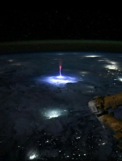 Bu görselde Dünya'nın atmosferinden yukarıya doğru uzanan, genellikle "sprite" olarak bilinen nadir bir yıldırım türü görülmektedir. Spritelar, fırtınaların üzerinde, mezosferde meydana gelen büyük ölçekli elektrik deşarjlarıdır ve genellikle kırmızımsı-turuncu renkte dikey sütunlar veya havuç benzeri şekiller olarak görünürler.