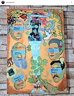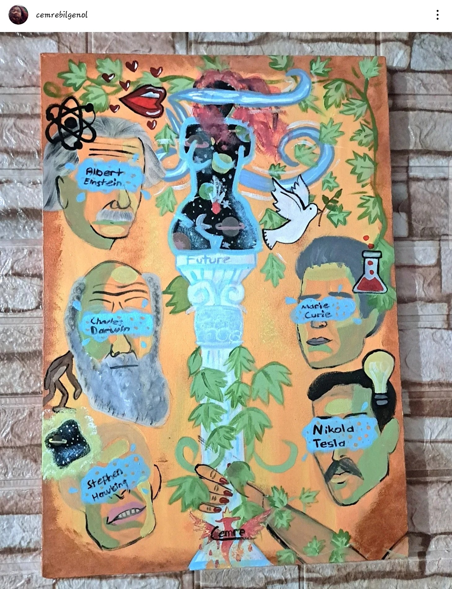 "Bilimin ve insanlığın geleceğini şekillendiren dahiler, fikirleriyle zamanın ötesine ışık tutuyor. Merkezde yükselen sütun, bilimsel ilerlemenin temeli; üzerinde yükselen evrenle bütünleşmiş figür ise benim geleceğe uzanan hayalimi simgeliyor. Einstein'ın dehası, Hawking'in azmi, Tesla'nın vizyonu,Curie'nin karalılığı ve Darwin'in keşifleri, bu yolun rehberleri... Bilim ,ışığını kaybetmezse, gelecek de aydınlık olur."