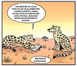 Bir soru değil de, espiri karışık bir sohbet konusu sadece. Karikatürde yazıldığı gibi hep en yavaş olanları yakaladıkları için geriye kalanlar daha hızlı olacak ve bu da yeni doğacak yavruların daha sağlıklı ve hızlı olması ihtimalini arttıracak. Tabii ki, evrim vahşi hayvanlarda da durup beklemiyor. Leoparların da daha hızlısının av yakalayıp hayatta kalma şansı daha yüksek olduğu için onlar da gittikçe hızlanıyor. Ama bu hızın de fiziksel bir sınırı vardır elbet.