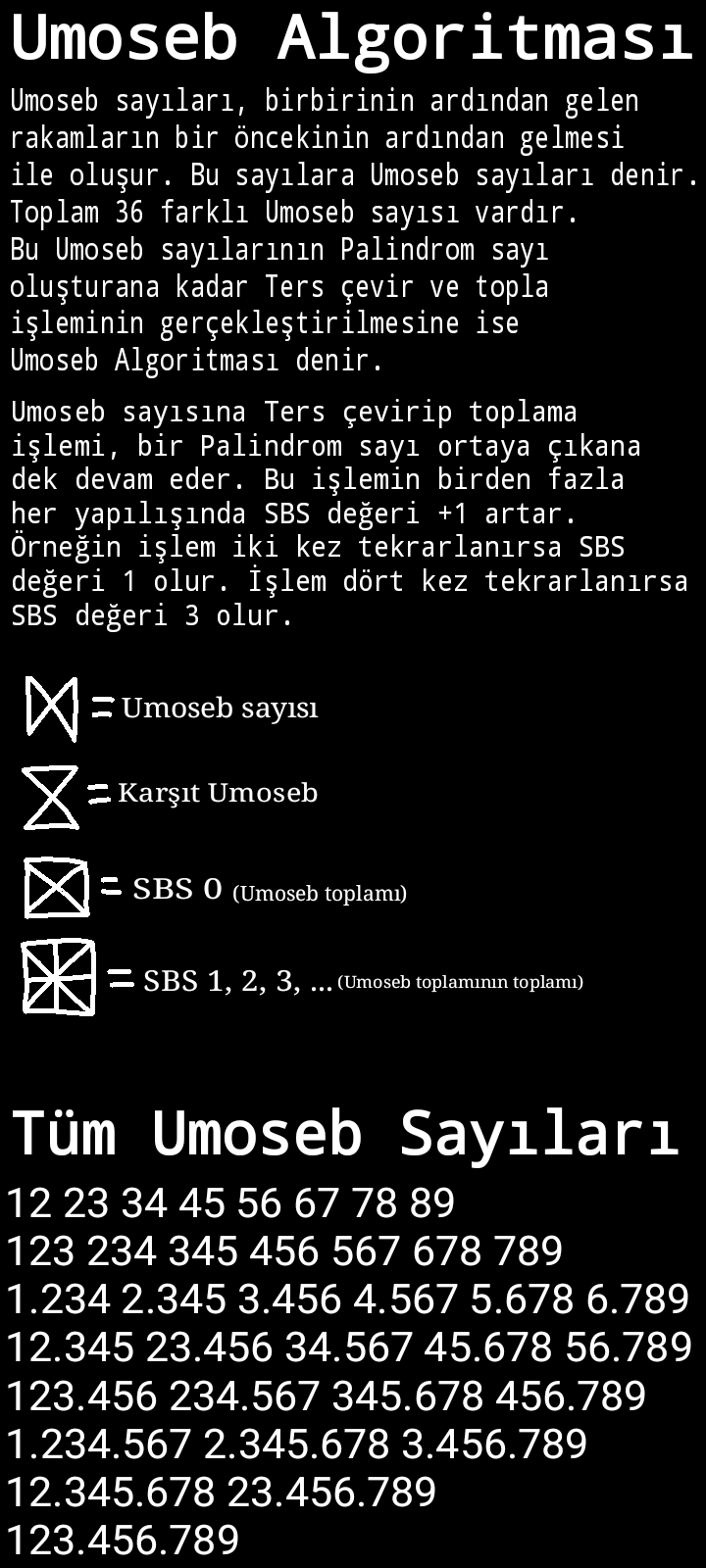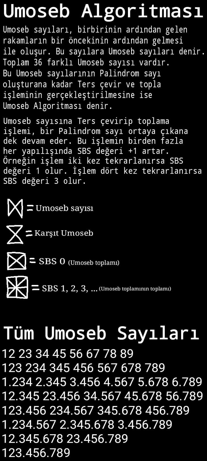 Bir matematiksel Algoritma buldum. 12 yaşımdan beri ilgimi çeken konuları harmanladım ve 16 yaşımda Umoseb Algoritmasını ortaya koydum. Kompleks şifrelemeler veya sayılar arasındaki eksantrik bağlar ilginizi çekiyorsa Umoseb sayılarına ve Algoritmasına bakmanızı ve incelemenizi öneririm. Matematik ilgi alanımdır, özellikle iş acayip yerlere vardığında teoriler üretmeyi çok severim. :)