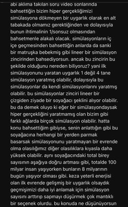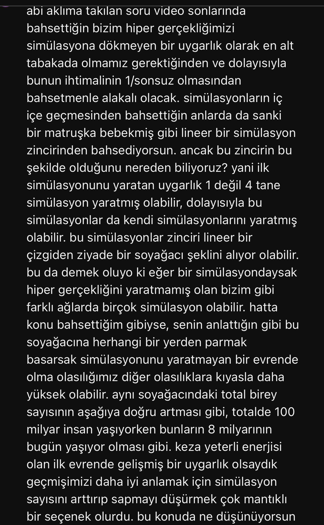Selamlar, az önce Evrim Ağacının simülasyon hipotezi ile alakalı videosunu izledim de, sorum oradaki bizim kendi hipergerçekliğimizi yaratan bir simülasyon olmadığımız için simülasyon zincirinin son halkası olmamız ve bunun ihtimalinin 0 oluyor olması argümanı ile alakalı olacak, sorumu karakter sınırına sığdıramayacağım için ss olarak gönderiyorum, iyi forumlar.