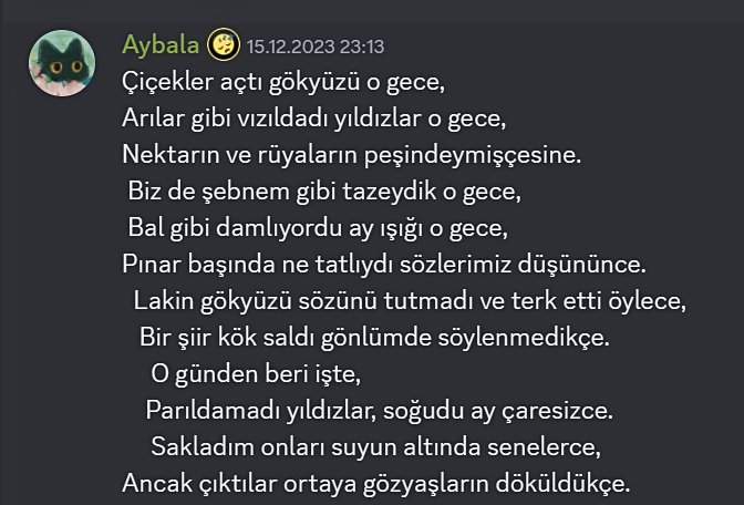 Şiir Yazma yarışmasının Aralık 2023 turunu kazanan Aybala (14thnoah) isimli üyemizi tebrik ediyoruz.