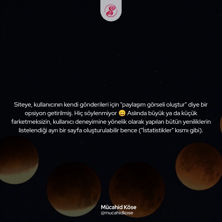 paylaşım görseli oluştur" diye bir opsiyon* getirilmiş. Hiç söylenmiyor 😄 Aslında büyük ya da küçük farketmeksizin, kullanıcı deneyimine yönelik olarak yapılan bütün yeniliklerin listelendiği ayrı bir sayfa oluşturulabilir bence ("İstatistikler" kısmı gibi).