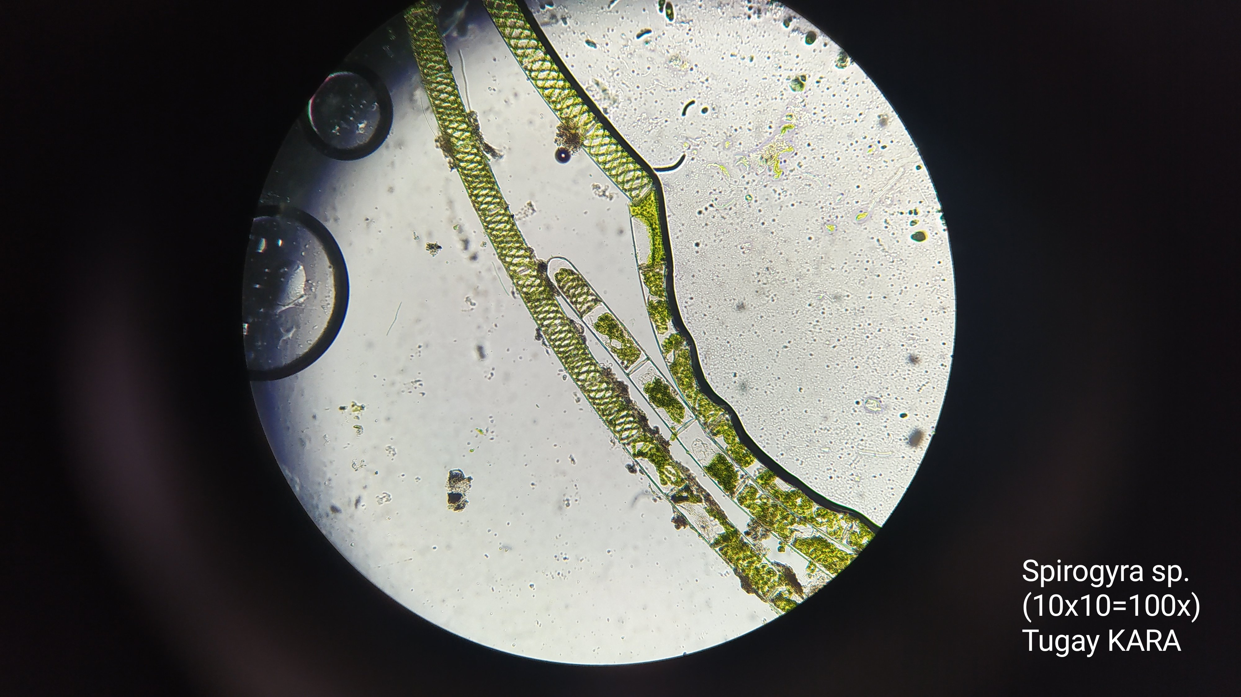 Spiral kloroplast dizilimiyle bilinen bir Spirogyra cinsi yeşil algin Leica DM500 model mikroskop altındaki görüntüsü. Spiral şekilde dizilmiş olması çok güzel değil mi 😄