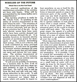 "... [İnsanlar] Bir kol saatinden büyük olmayan, ucuz bir cihazı yanında taşıyarak iletişim kurabilecek ve iletişim kurduğu kişi, onu kara ya da deniz fark etmeksizin binlerce kilometre öteden duyabilecek. Bir konuşma ya da şarkıyı en uzak mesafelere ulaştırabilecek. Bir fotoğraf aynı şekilde aktarılabilecek..."