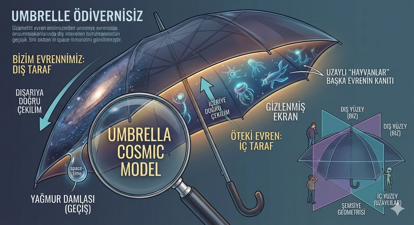 Uzaylılar hayvan olabilir nasılsa uzaylıların yapısı bizden farklı işte uzaylıların başka evrende yaşadığı kanıtı nasılsın şemsiyenin üzerinden akan bir yağmur tanesi iç tarafında biraz yol kat edip düşüyorsa bizde evrenin etrafımdan dolaşıp iç taraftaki ekranı görebiliriz biz dış taftayız nasılsa dış tarafta aşşağı doğu çekiliyorsak iç tarafta ise yukarı çekiliyoruz bu yüzden yağmur damlası yol kat edebiliyo