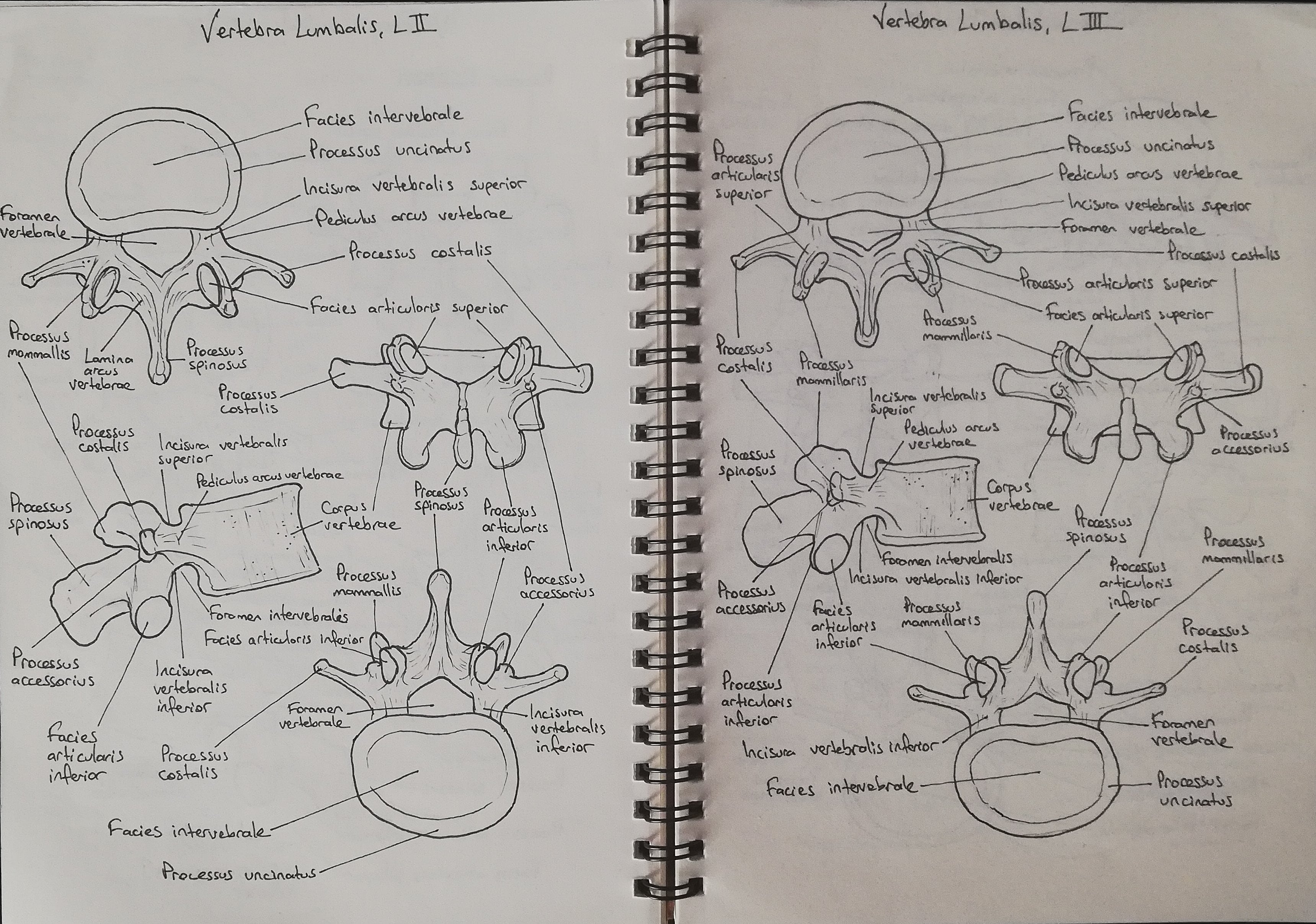 Vertebra lumbalis, L2 ve L3 çizimim. Ayırt etmek zor gibi. Evet, zor ama ayırt edilemez değil. Processus costalisin daha uzun olması, spinosus uzantısının şekli, gibi gibi...