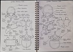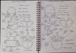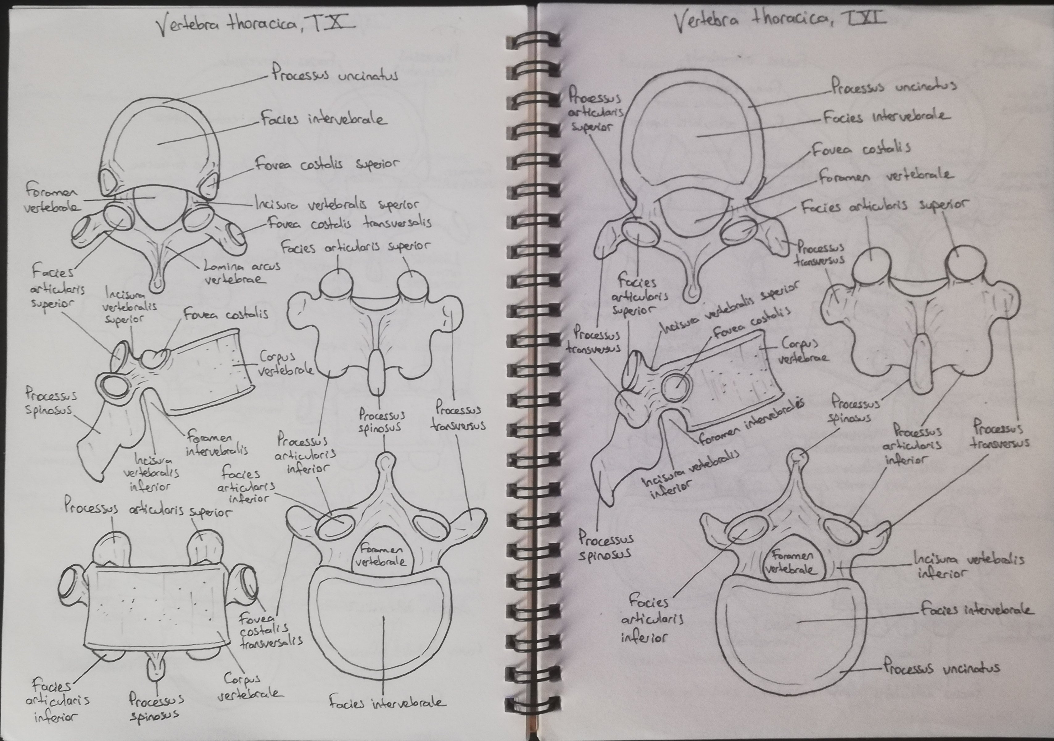 Vertebra thoracica, T10 ve T11 çizimim. T10'dan sonra artık büyük değişiklikler göze çarpar oldu. Processus transversuslar aşırı küçük hale geldi. T10'daki fovea costalis transversalis, T11 'de artık neredeyse yok. T10' da omurun superior kısmında bulunan fovea costalis, T11'de omurun ortasına doğru yer aldı ve costae11 ile tek başına eklem yapmaktadır.