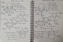 Vertebra thoracica, T4 ve T5 çizimim. Neredeyse aynı genişliklere sahip olduklarından thoracicaları ayırt etmesi zordur. Spinosus uzantıları uzun,, sivri ve aşağı doğru eğiktir.