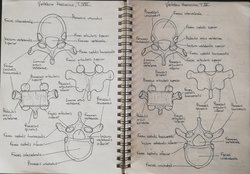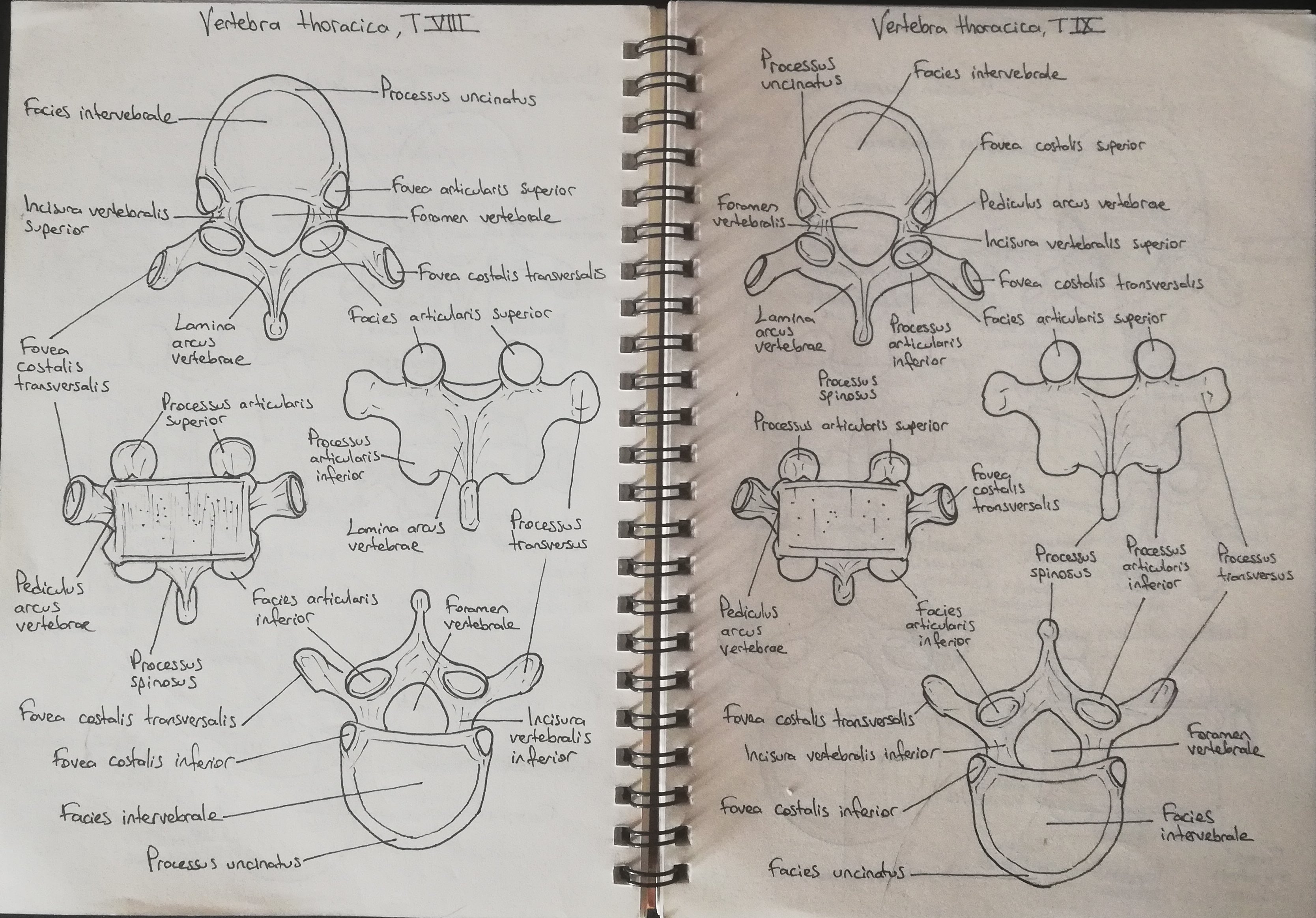 Vertebra thoracica, T8 ve T9 çizimim. Paylaşımlarım aynı gelebilir ama omurların anatomik yapıları neredeyse aynı ve ben üşenmeyip tüm omurları çiziyorum. Çizerek daha kalıcı öğreniyorum. Neyse ki biyolojide öğrenilecek çok şey olduğu kadar çizilecek de çok şey var.