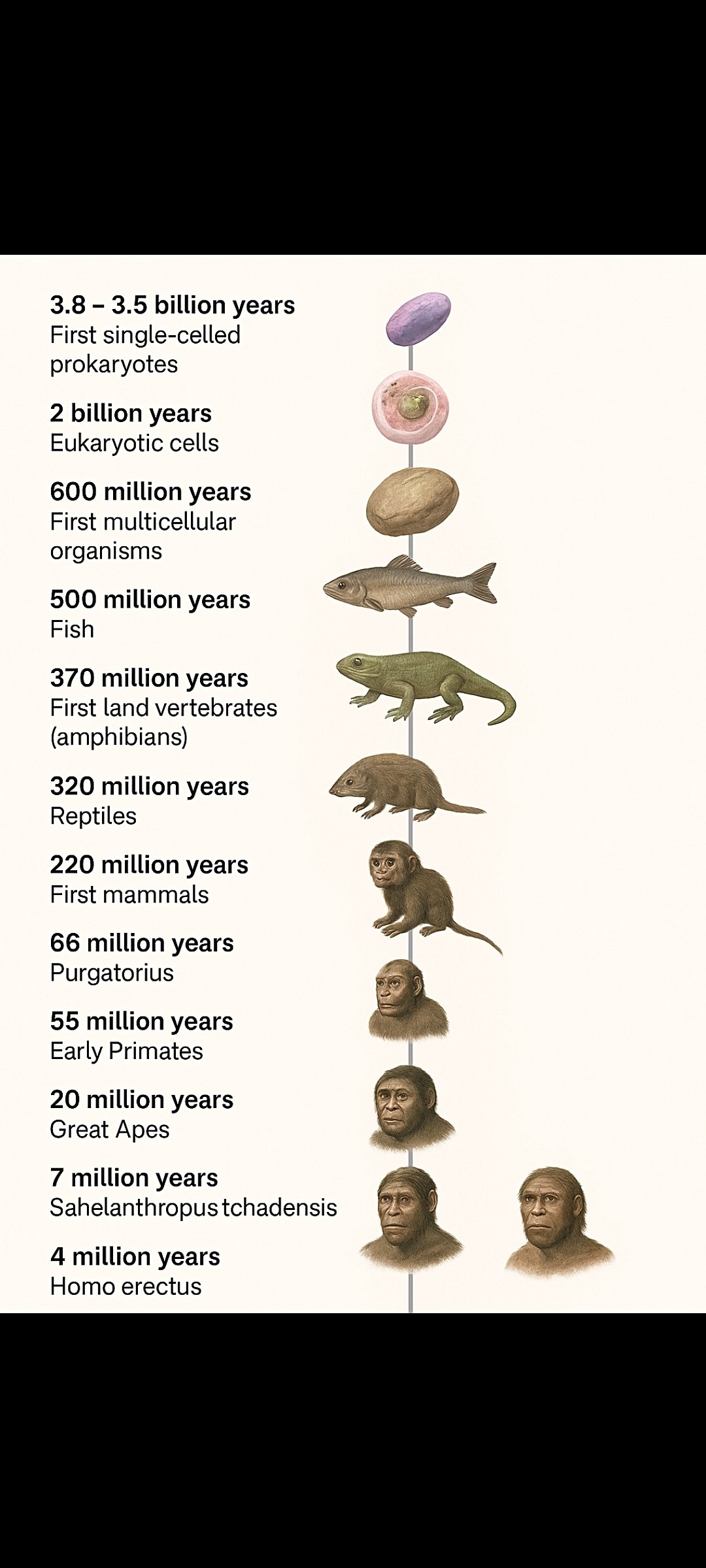 Yapay zeka destekli olarak oluşturulmuş homo ve homo türüne evrimleşmiş olduğu düşünülen türlerin ilk canlı oluşumundan itibaren 4 milyon yıl önceye kadar olan zaman çizelgeli görseli.