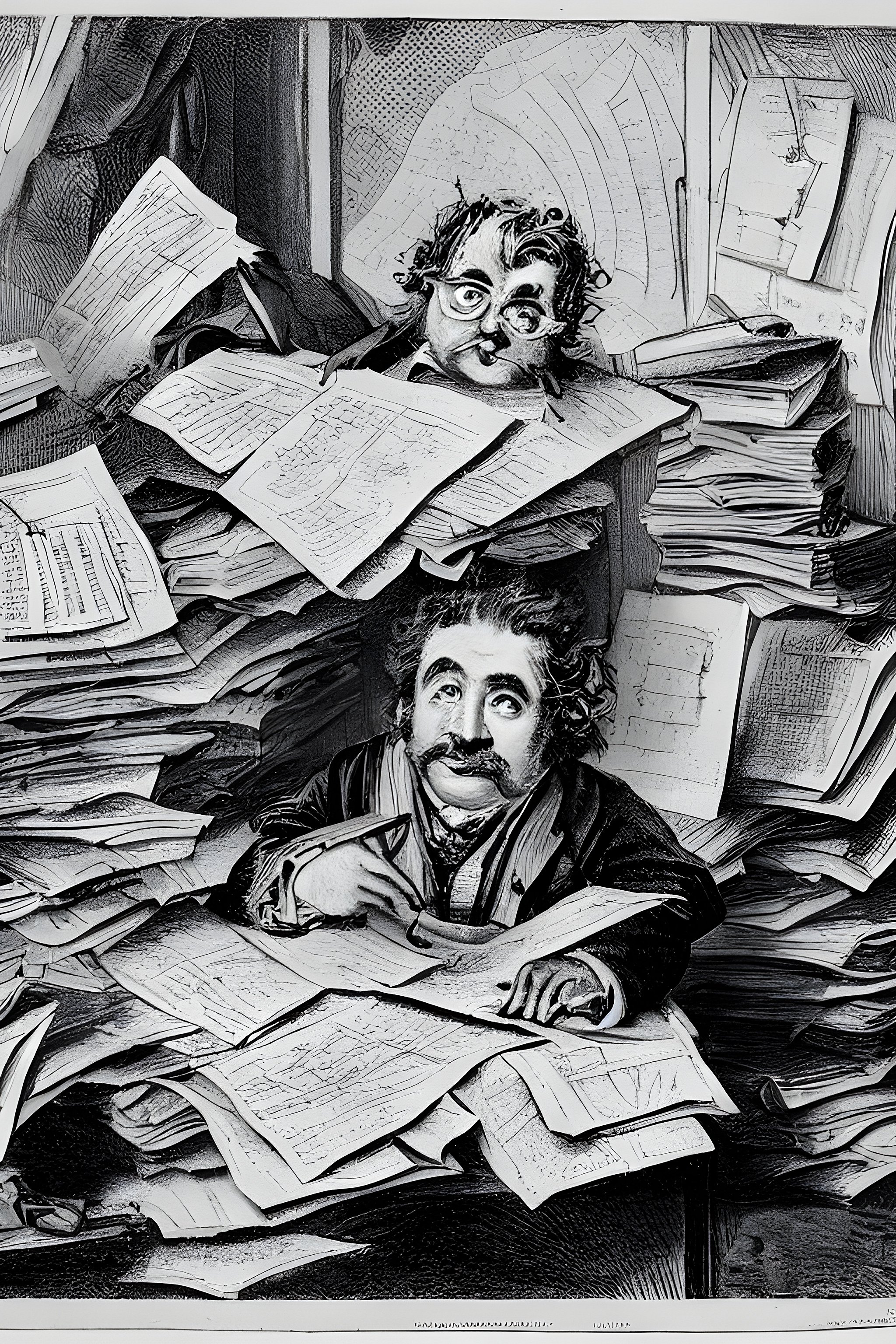 Scientist with disheveled hair sitting at a table full of piles of papers, Old Drawing Generator API, DeepAI.