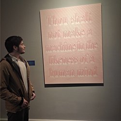 Sanat ile bilimin buluşması... İstanbul'da Pera Müzesinde ziyaret ettiğim bir sanat galerisinde böyle bir tabloya denk geldim. Konusu gereği ayrıca ilgimi çeken bu tablo, Arno Beck'in "Thou shalt not make a machine in the likeness of a human mind" (Türkçesi: "İnsan zihnine benzer bir makine yapmamalısın") başlıklı bir eseri. Eklediğim bağlantı üzerinden bu eseri ve galeriyi 3 boyutlu sanal bir tur şeklinde siz de deneyimleyebilirsiniz.