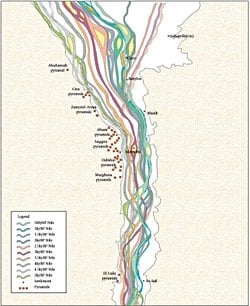 Nil Nehri'nin yatağının/akışının günümüzden 5000-500 yıl önce arasında değişimi... Bundan 4500 yıl kadar önce Nil Nehri piramitlerin "yanından" (çok yakınından) akıyordu.