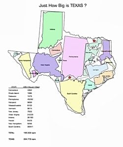 ABD'nin 50 eyaletinden biri olan Teksas, yaklaşık olarak Türkiye büyüklüğünde. Görseldeki gibi Teksas içine 13 diğer eyaleti koyduğumuzda, geriye hala 7.5 tane Ankara kadar yüzey alanı kalıyor.