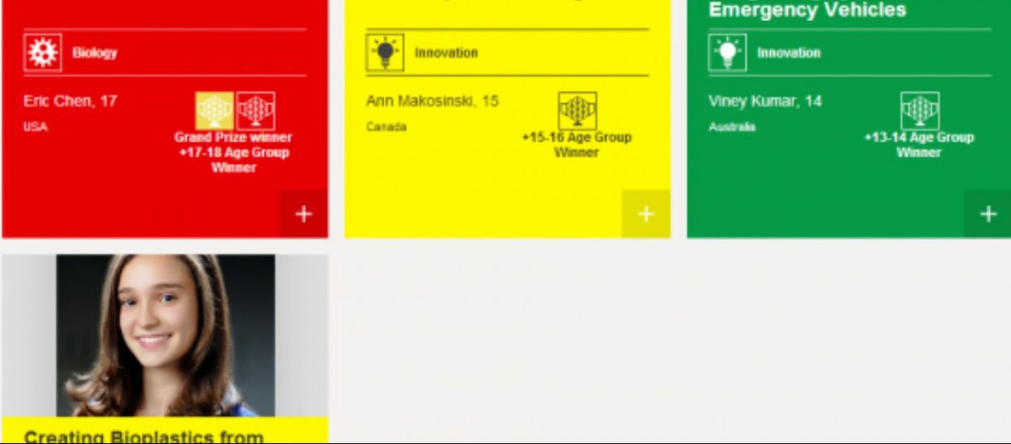 17-18 Yaş Grubu Büyük Ödül: ABD'den 17 yaşındaki Eric Chen, Yeni Bir Grip Önleyici İlaç başlıklı biyolojik çalışmasıyla birinci oldu. Eric, yaptığı projesinde tüm dünyayı tehdit eden H5N1 veya H7N9 gibi grip virüslerini hedef alıyor. Geliştirdiği endonükleaz inhibitörü (engelleyicisi) sayesinde kıtalar arası salgına neden olabilecek tüm grip virüsleri engellenebiliyor. Yaptığı bilgisayar modellemesi ve biyolojik çalışmalarla, geliştirdiği endonükleaz inhibitörünün başarılı olduğunu doğruladı. Ayrıca inhibitörün kapsamlı bir yapısal analizini de yaptı. Böylece gelecekteki grip aşılarının ön çalışması tamamlanmış oldu.