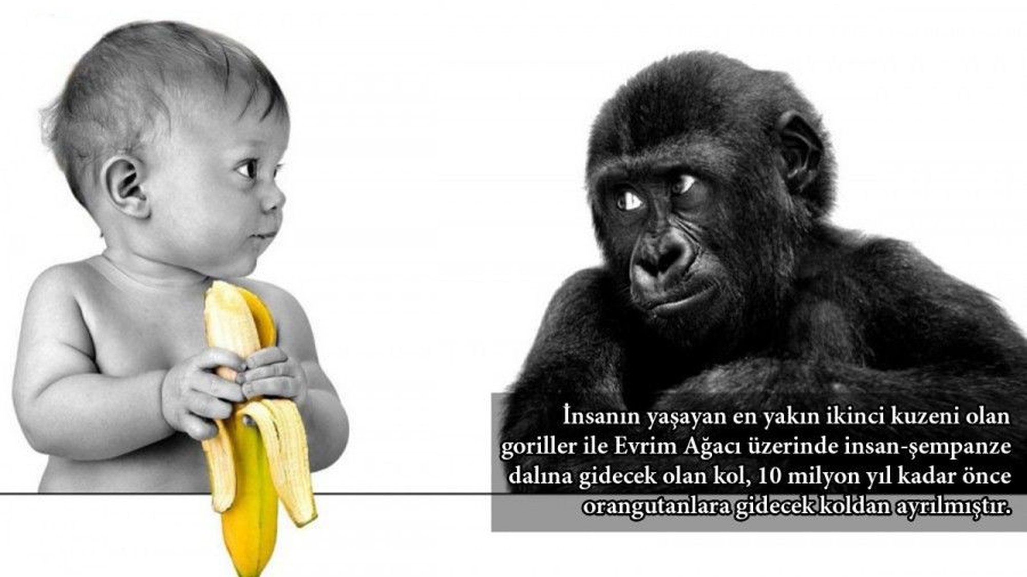 İki primat… Biri orman yaşamının getirileriyle hayatına devam eden herbivor (otçul), diğeri milyonlarca yıl önce savan macerasına atılan atalarının yadigarı olarak omnivor (hem etçil hem de otçul). Büyük bir çeneye sahip goril, büyük bir beyne sahip insan… Peki bu farkları doğuran çatallanma ne zaman oldu? Bugüne kadar bildiklerimiz ne kadar doğru? Goriller ve insanların ortak ataları nerede yaşadı?