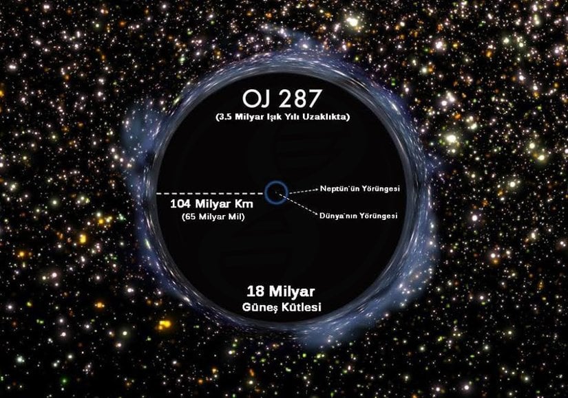 Bu kadar tanım yeter. İşte karşınızda OJ287... Kendisi 18 milyar güneş kütlesinde, keşfedebildiğimiz en büyük kara deliklerden biridir (güvenilir tahminler üzerine bir spekülasyon olduğunu söylemekte fayda var). Eğer bu kara delik Güneş Sistemi'mizin merkezinde olsaydı, olay ufkunun toplam çapı 211,7 milyar km olurdu. Karşılaştırma amaçlı belirtelim ki Plüton'un Güneş yörüngesinde kat ettiği mesafeler 4.4-7.4 milyar kilometreden ibarettir. En uzak cüce gezegen olan Eris’in bile güneşe uzaklığı 11 milyar kilometredir. Hatta hacmi Güneş’in 5 milyar katı olan gözlemlenen en büyük yıldızlardan biri olan UY Scuti’nin bile çapı sadece 2,4 milyar kilometredir Bu hiper devin bile süper kütleli kara deliğin yanında 1 pikselden öteye geçmesi için uzunluk birimlerimizi nanometrelere çevirmeliyiz.